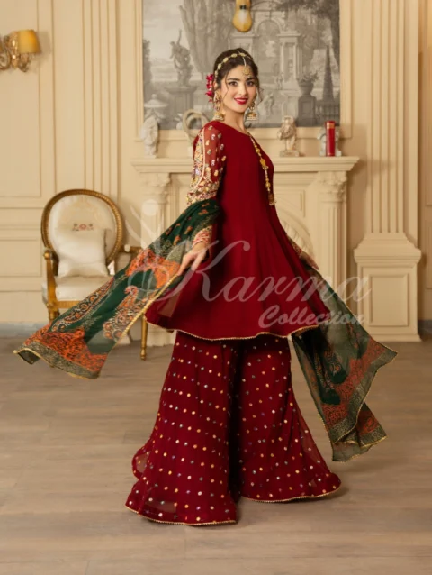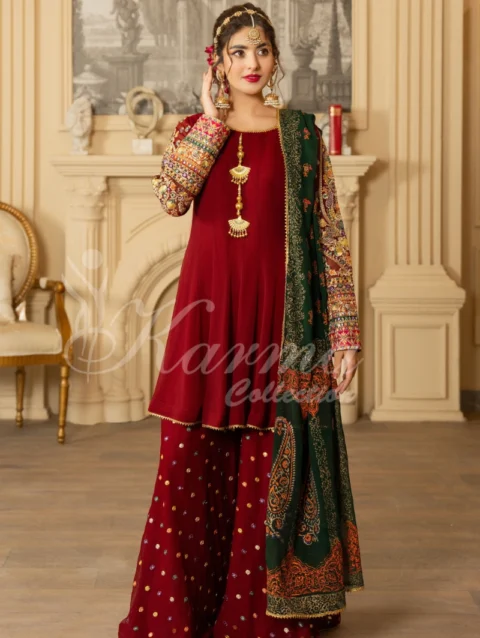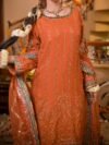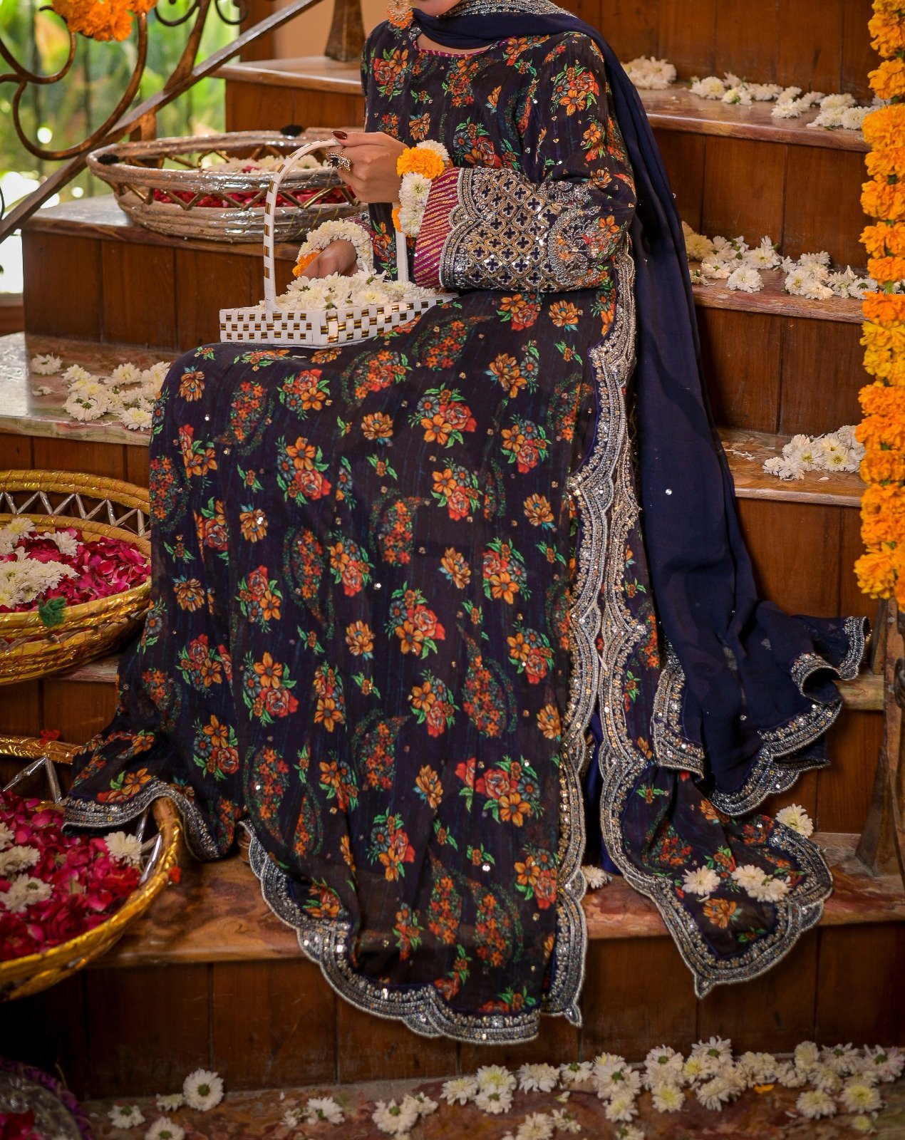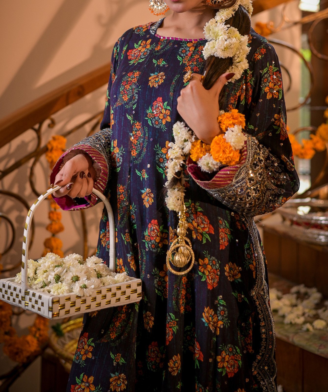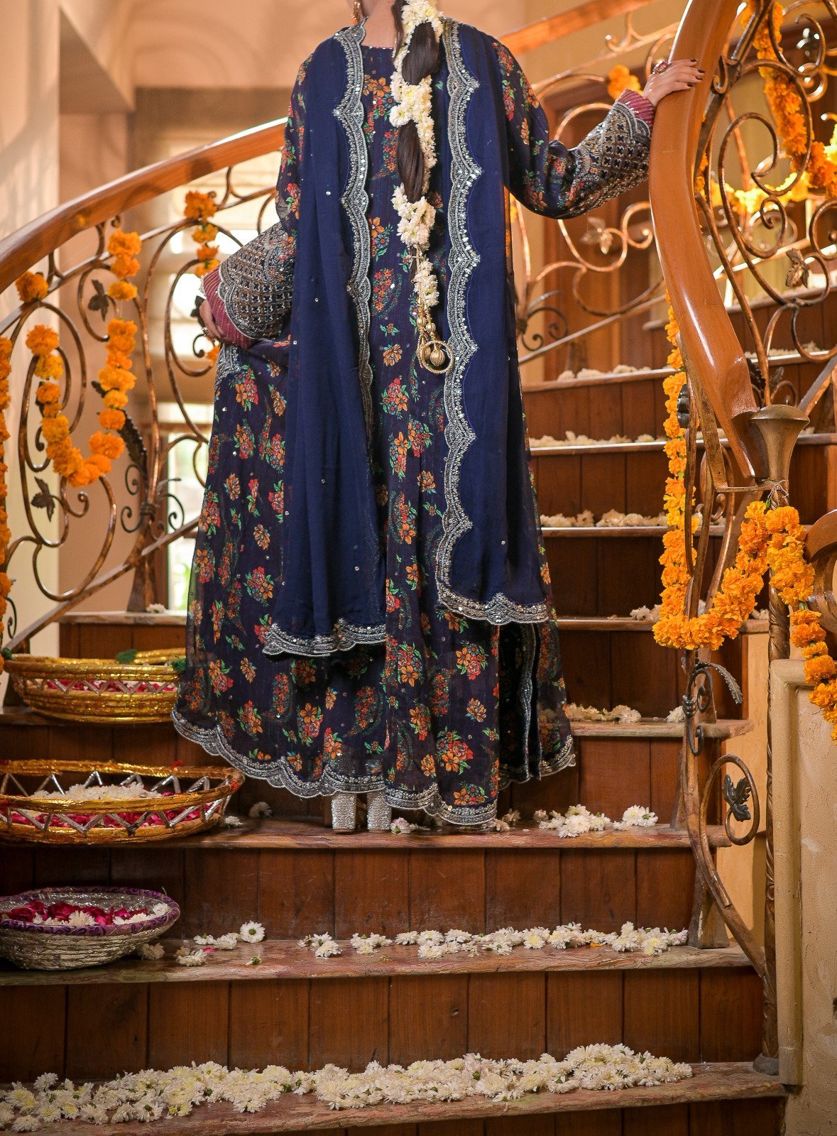 A classically rich composition is portrayed on this elegant ensemble rendered in blue shade. It features a mesmerizing elongated floor length maxi beautifully adorned with intricate embroidery with floral designs and enhanced with cutwork. Paired with a contemporary solid trouser, this graceful yet elegant outfit is a style statement to look stylish this season.