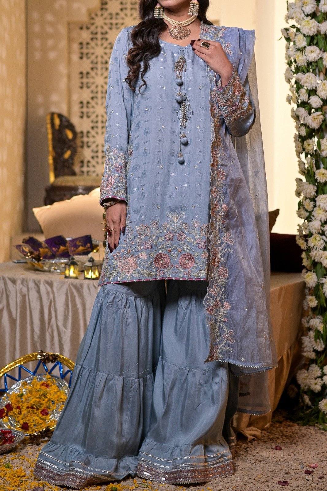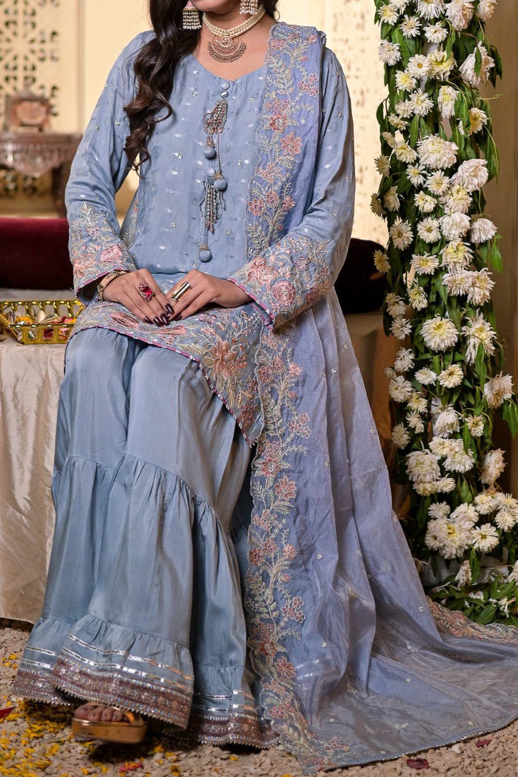 Look like a vision of perfection in this garment from the latest collection of RAFIA. Beautifully designed dress enhanced with embroidery with thread, tilla and hand beading on neckline ,paired with embroidered duppata