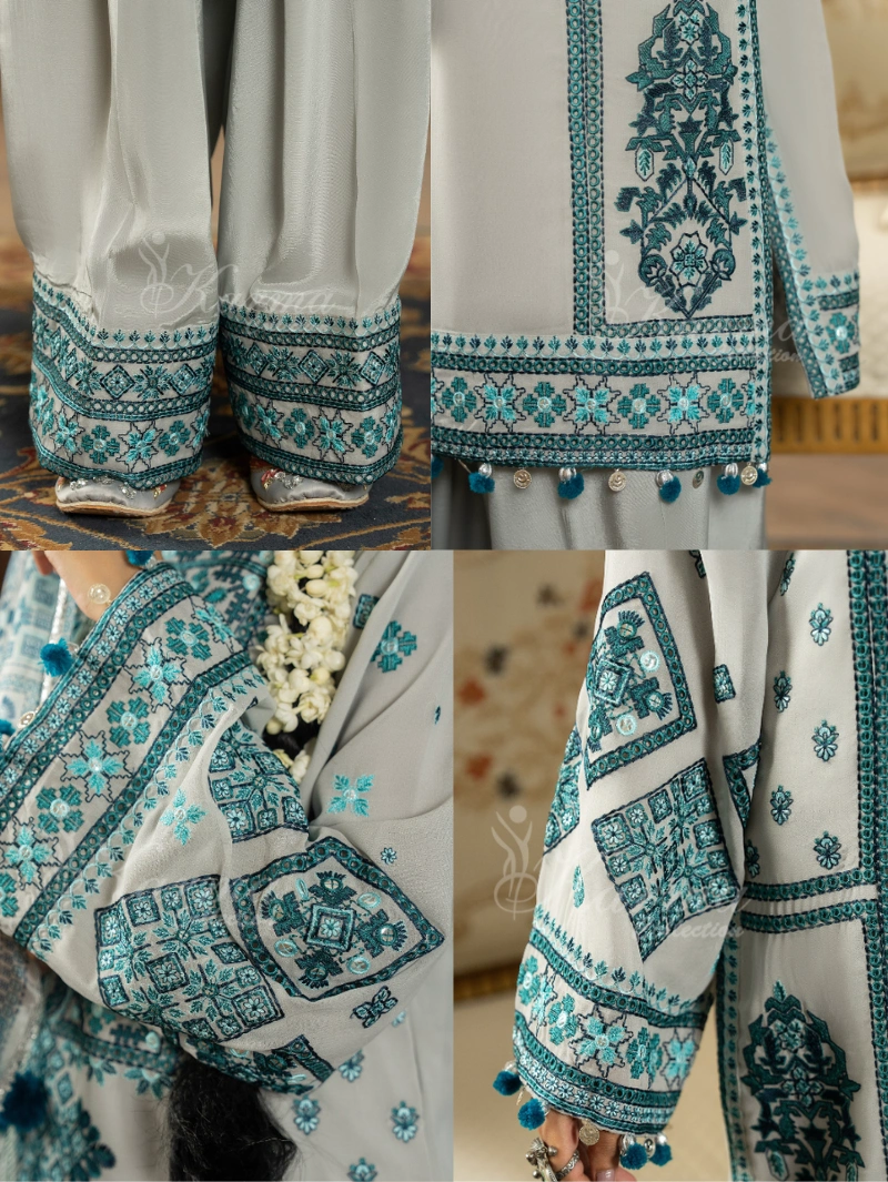 Shirt: Plain Georgette Shirt with Multi Embroidered Thread and Panni Work with Dori Tussels on