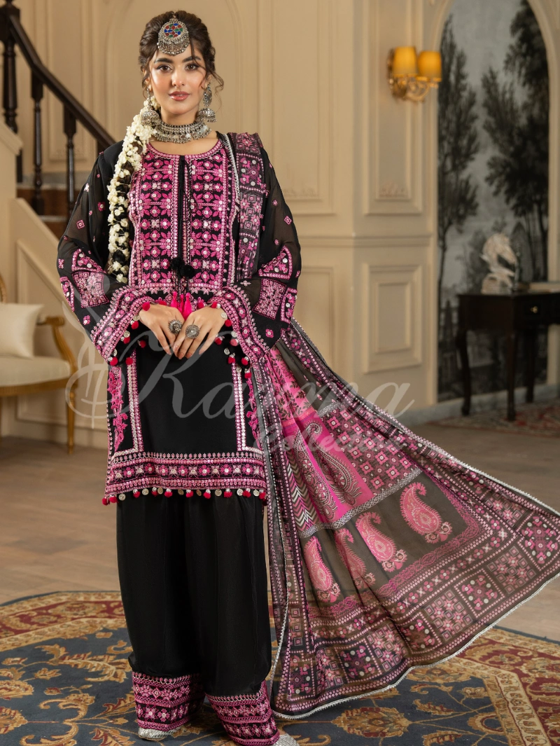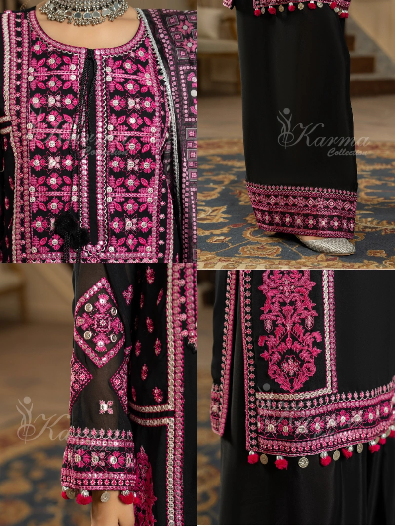 Shirt:Plain Georgette Shirt with Multi Embroidered Thread and Panni Work with Dori Tussels on