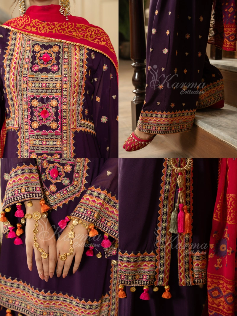 Shirt: Georgette Chiffon Shirt with Tilla and Multi Thread Work Embroidery , Tussels on