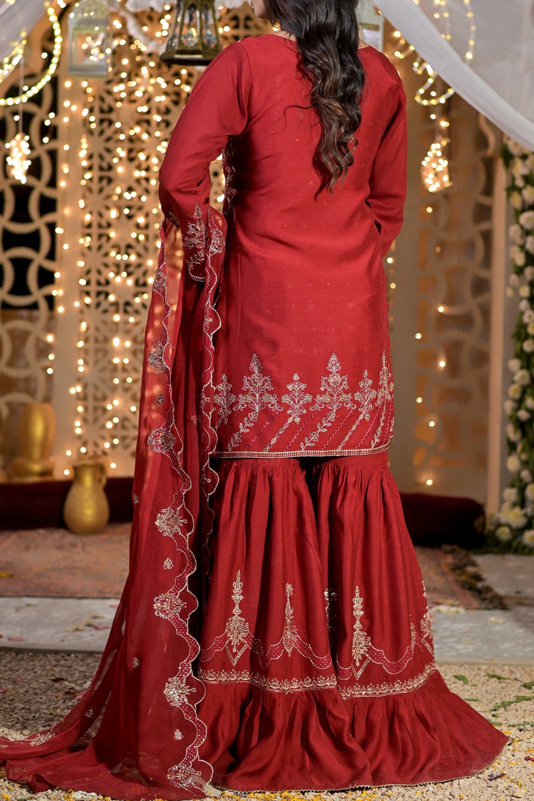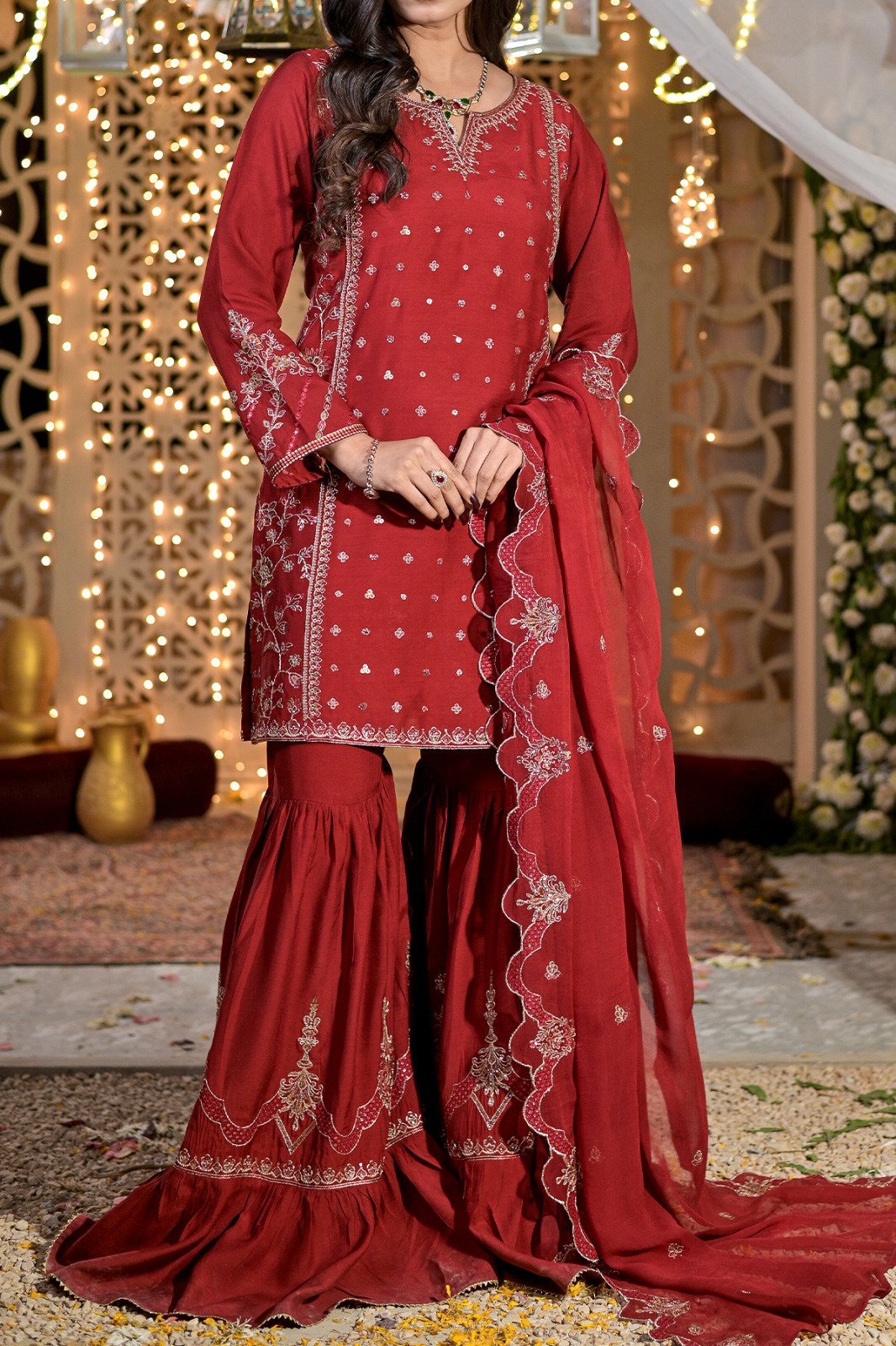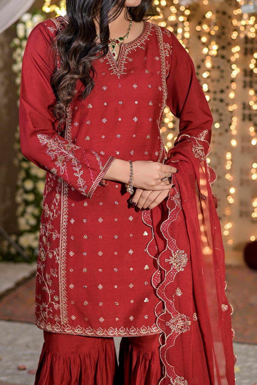 Look like a vision of perfection in this garment from the latest collection of RAFIA. Beautifully designed dress enhanced with embroidery with thread, tilla ,paired with embroidered duppata
